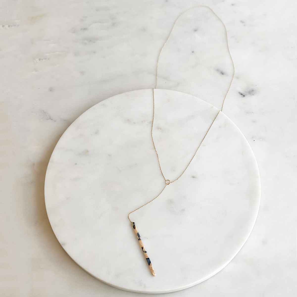 A y-necklace that is on a long, dainty gold chain with an acetate bar in a cream/black mix dropping from the bottom. This necklace is designed to be adjusted by using the jump ring in the middle to make it longer or shorter. This necklace would pair nicely with the Kelly Flower Hoop in Cream/Black.