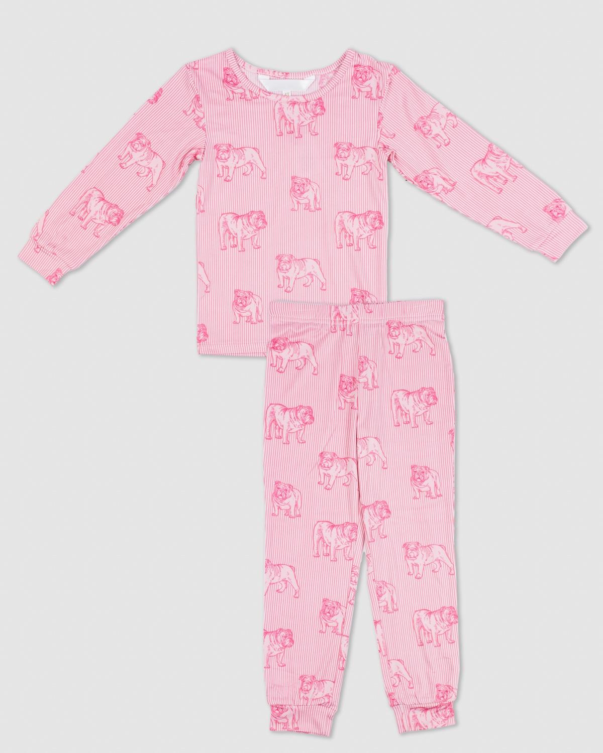 Kid's Bulldog Stare Long Sleeve Pajamas #: 273253100-P $33.00 Quantity discounts available QuantityPrice (0)No Reviews yet Ship 2 Available Pickup in Store - FREE! Select Store to check availability. In Stock Select options Back $33.00 Size : 3T 4T 5T 6 2T Gift Certificate Amount Is Variable Amount Line Item Is Variable Amount Item Options Gift Wrap Id Gift Wrap - Message From Gift Wrap - Message Text Gift Wrap - Message To Gift Wrap Item : 99-L Gift Wrap - Large 99-M Gift Wrap - Medium 99-S Gift Wrap - Small GiftMessage Gift Message Planning to give this as a gift?Add Gift Wrap or FREE Gift Messaging! Quantity -+ Add to Shopping Cart Care Machine Wash Cold & Tumble Dry Low Dimensions N/A Material Polyester & Spandex Detailed Description Cozy up in team spirit with these Kid's Bulldog Stare Long Sleeve Pajamas. Featuring a fun pink and light pink bulldog print, this set brings comfort ... CareDimensionsMaterialDetailed Description Back Machine Wash Cold & Tumble Dry Low Back N/A Back Polyester & Spandex Back Cozy up in team spirit with these Kid's Bulldog Stare Long Sleeve Pajamas. Featuring a fun pink and light pink bulldog print, this set brings comfort and cheer to bedtime, whether it’s game day or any day. Reviews 0 Back Ratings & ReviewsNo reviews availableBe the first to Write a Review