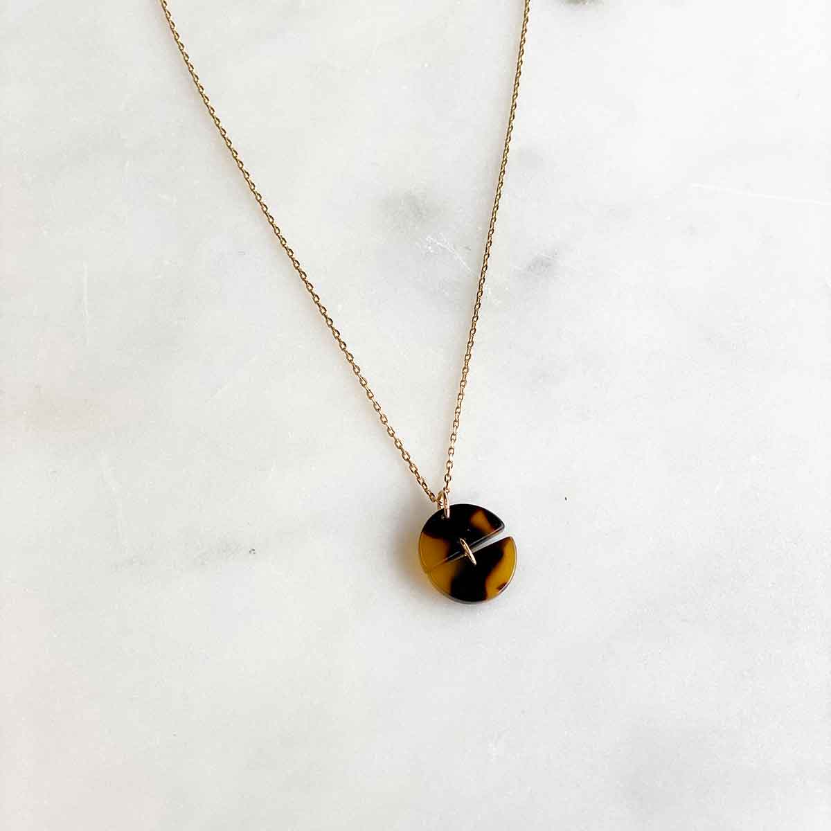 A thin gold chain with two half circles in tortoise colored acetate at the center. The two pieces of acetate are connected by a gold jump ring. This necklace layers nicely with the Christina Necklace in Tortoise.