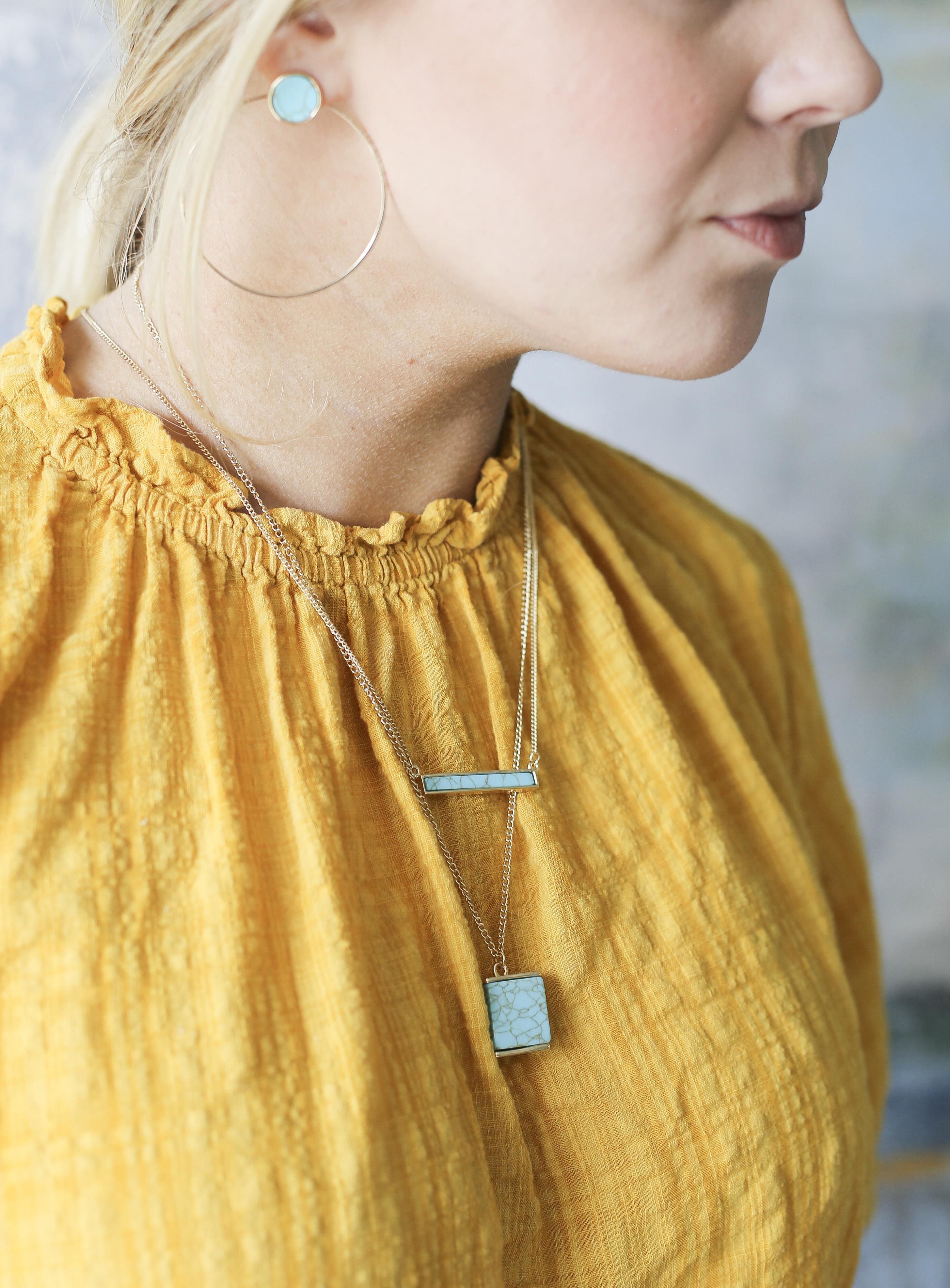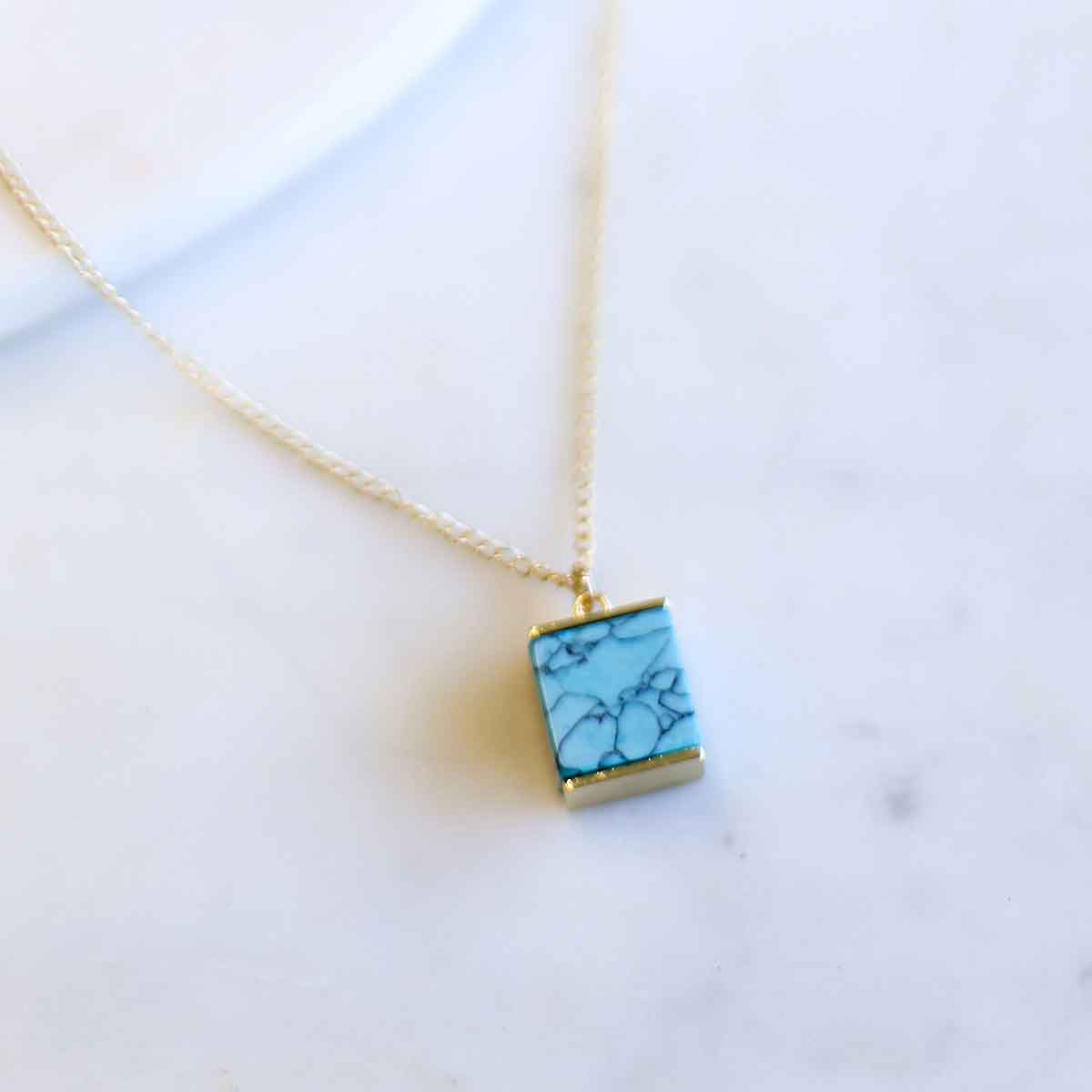A cubed turquoise stone with gold framework and delicate metallic chain combine to create the Marsala Stone Necklace.