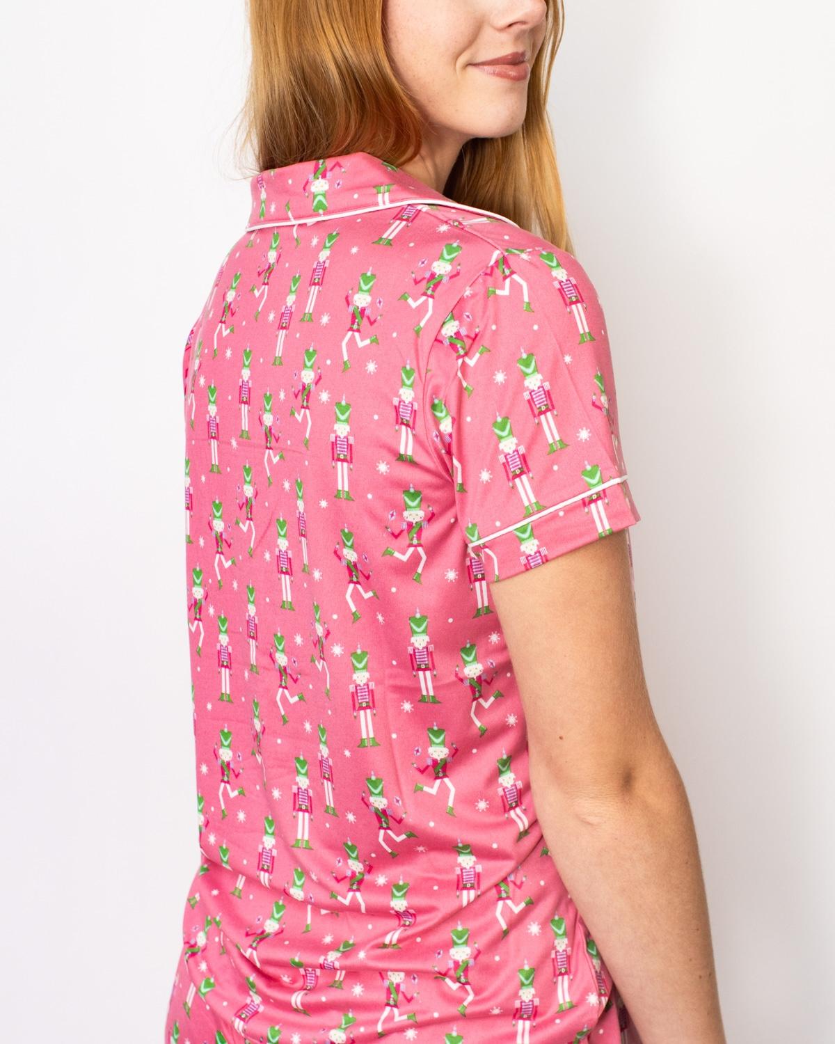 Drift into sweet holiday dreams with our Nutcracker Cutie Short Sleeve Button Up Sleep Shirt. Designed in a playful pink and multi nutcracker print, this relaxed-fit shirt brings festive charm and cozy comfort to your bedtime routine.