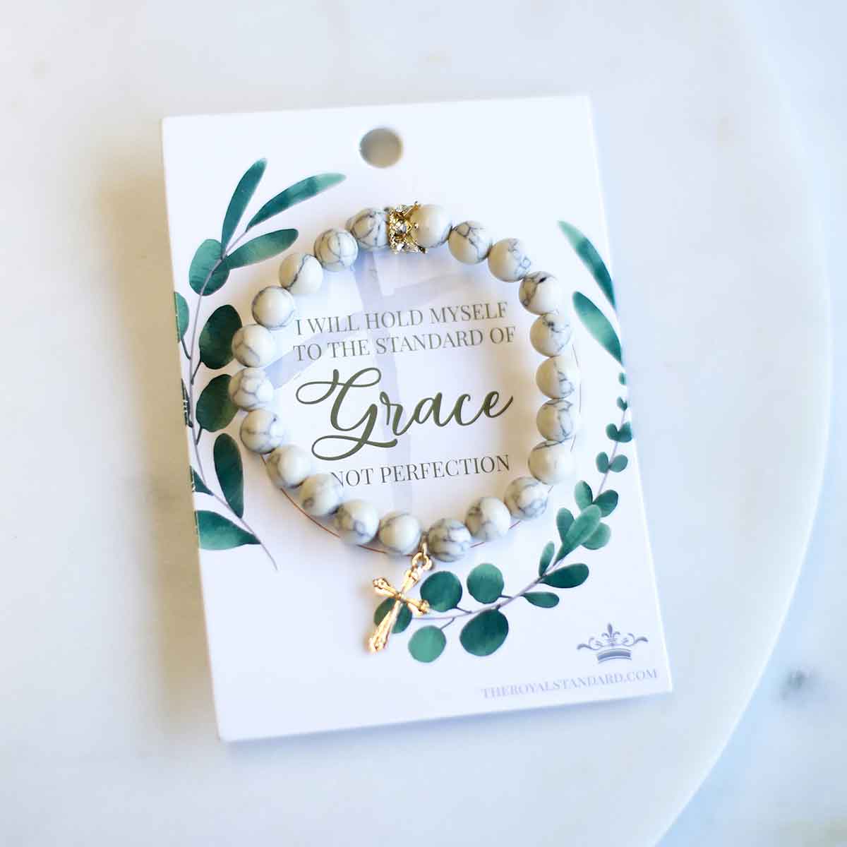 A beaded white marble bracelet with a gold crown in the center. A beautiful gold cross charm drops from the bracelet. This bracelet would pair perfectly with the Ravenna Stone Earring in White and stacks well with any of our other beaded bracelets.